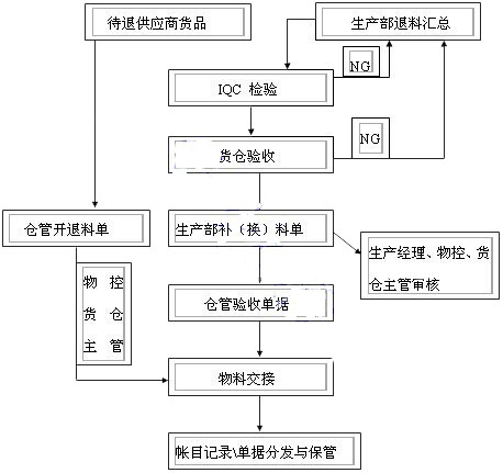 4、供應(yīng)商所送物料為誤送,超送或其他原因,經(jīng)物控、采購、總經(jīng)理協(xié)商簽名后,辦理退貨手續(xù)。此類退料不計入財務(wù)核算范圍。