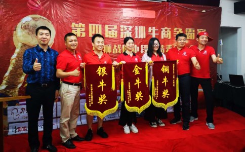 深圳市單仁資訊有限公司總經(jīng)理楊光、深圳市牛商爭霸賽總司令石華、雄獅戰(zhàn)隊司令劉海峰、政委王小峰和金、銀、銅牛獎企業(yè)合影!