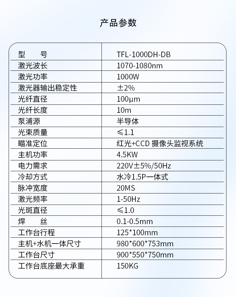 采用光纖激光器,反射率高,能量強,免維護,免調光,功耗少,相比傳統 模具焊來說,體積小,安全,穩定性好超長使用壽命。 1000W光纖激光器,滿足銅、鋁焊接量大的模具及產品焊接加工需要。 高承重底座及工作臺,保持輕便靈活的優點,同時提供更高承載能力。 配備.1.5P大功率一體式水冷水機,保證了大功率焊接的穩定性。