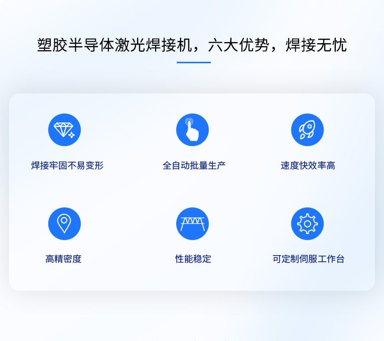 安全性:設(shè)備采用雙滑臺左右工位滑入進(jìn)行焊接,外部安全光柵 柔性化:進(jìn)出工作臺柔性化程度高,適合多種產(chǎn)品的安裝和定位,滑臺可帶旋轉(zhuǎn)機(jī)構(gòu)焊接圓形產(chǎn)品 精度高:各工序采用精密加工裝配,嚴(yán)格控制工序變形 焊縫特點(diǎn):焊接精密、牢固和密封的焊接 床身結(jié)構(gòu):高架式結(jié)構(gòu),XZ軸移動(dòng),擁有最大的加工空間,極高的動(dòng)態(tài)性能 通用性:六軸機(jī)構(gòu)設(shè)備雙工位工滑臺焊接,XZ軸左右切換焊接,并可加裝旋轉(zhuǎn)工裝焊接。